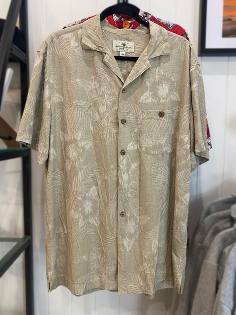 Beautiful Vintage Silk Hawaiian Shirt by Island Shores. 100% Washable Silk. Taupe woven background with creme desings. Difficult to show in photos. Pattern is lovely. Authentic. Preowned. Pristene Condition. Size M